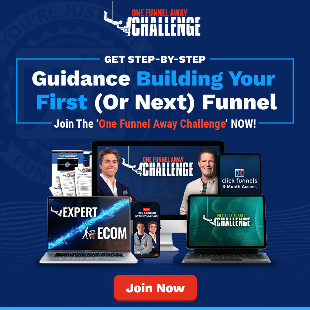 Join the One Funnel Away Challenge and follow a guided system to build, launch, and improve your funnel.